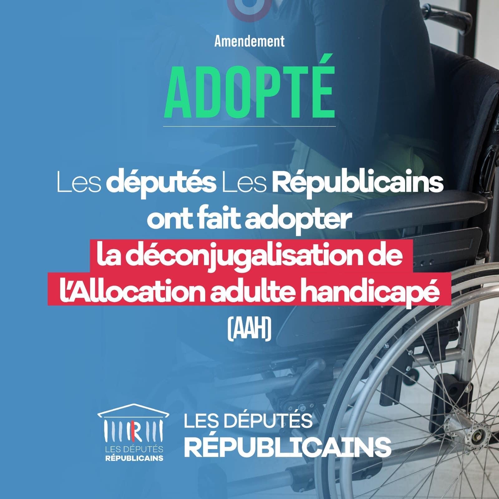 Attendue depuis trop longtemps, soutenue et portée depuis 5 ans par les Républicains, notre groupe à l’Assemblée nationale a fait adopter un amendement en faveur de la déconjugalisation de l’Allocation adulte handicapée (AAH).